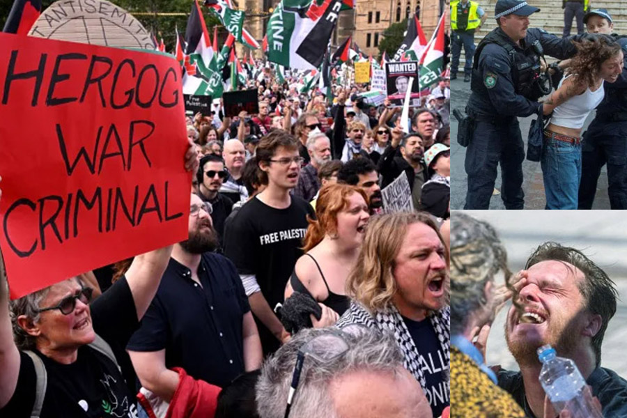 Reconhecida por sua forma pacata, a Austrália se converteu numa zona de guerra nesta segunda-feira (9), com a polícia usando e abusando de bombas de gás lacrimogêneo, spray de pimenta, cavalos e cacetetes na tentativa de conter os protestos em Sydney contra a indesejada presença do presidente Israel, Isaac Herzog, ao país.
