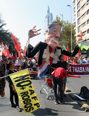 Com faixas e cartazes condenando as Administradoras de Fundos de Pensão (AFP), que privatizaram a Previdência pública para meia dúzia de companhias transnacionais especularem, arrochando brutalmente os valores das aposentadorias – que pagam aos homens somente 30% do último salário e às mulheres 25% -, a população se somou à paralisação, demonstrando o seu repúdio ao descaminho neoliberal do governo.