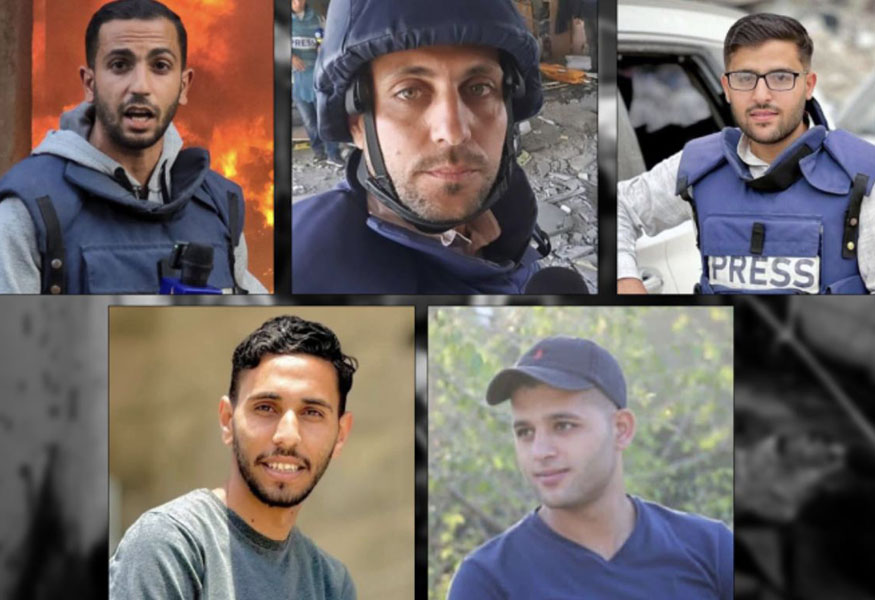 Acima, cinco dos jovens jornalistas e câmeras executados pelos sionistas ao lado de al Sharif (Al Jazeera)