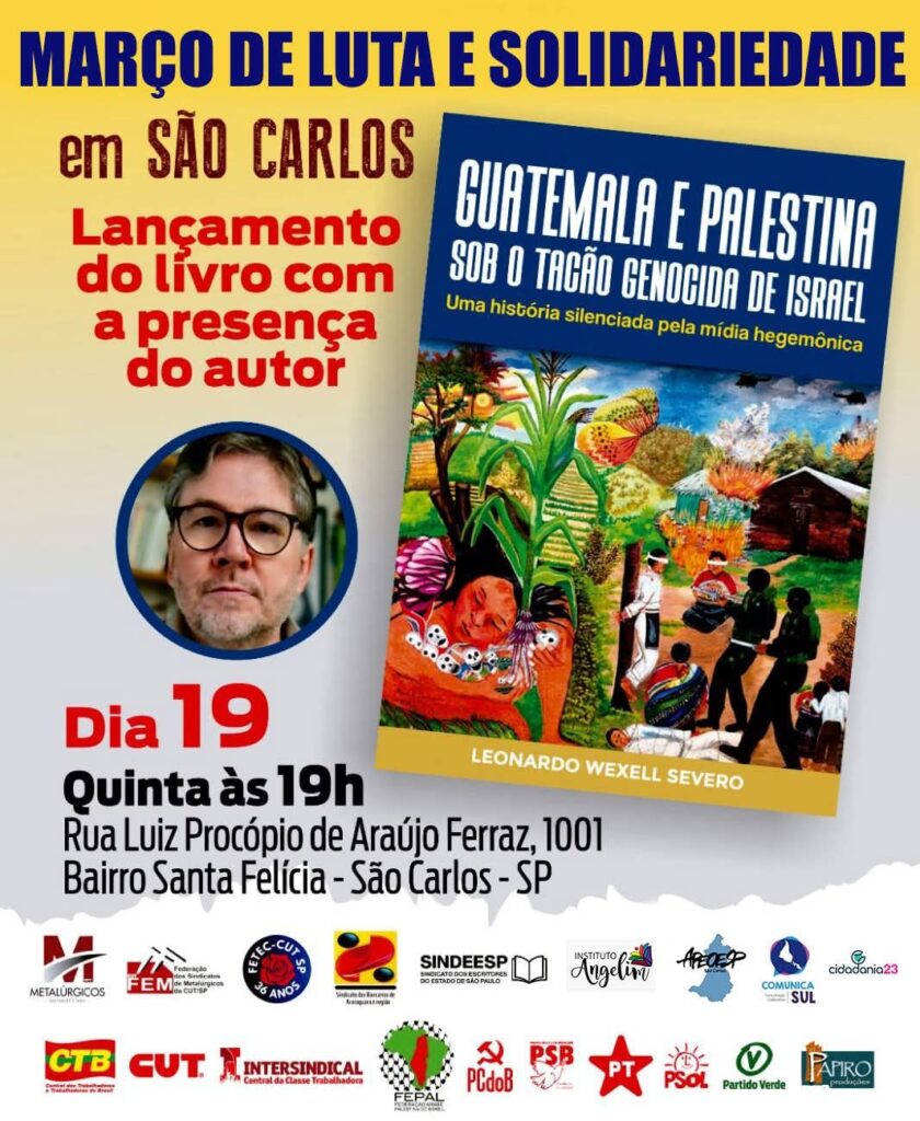 O Sindicato dos Metalúrgicos de São Carlos e Ibaté e a Federação Estadual dos Metalúrgicos lançam na quinta-feira (19), às 19 horas, o livro-reportagem “Guatemala e Palestina sob o tacão genocida de Israel – Uma história silenciada pela mídia hegemônica”, do jornalista Leonardo Wexell Severo.