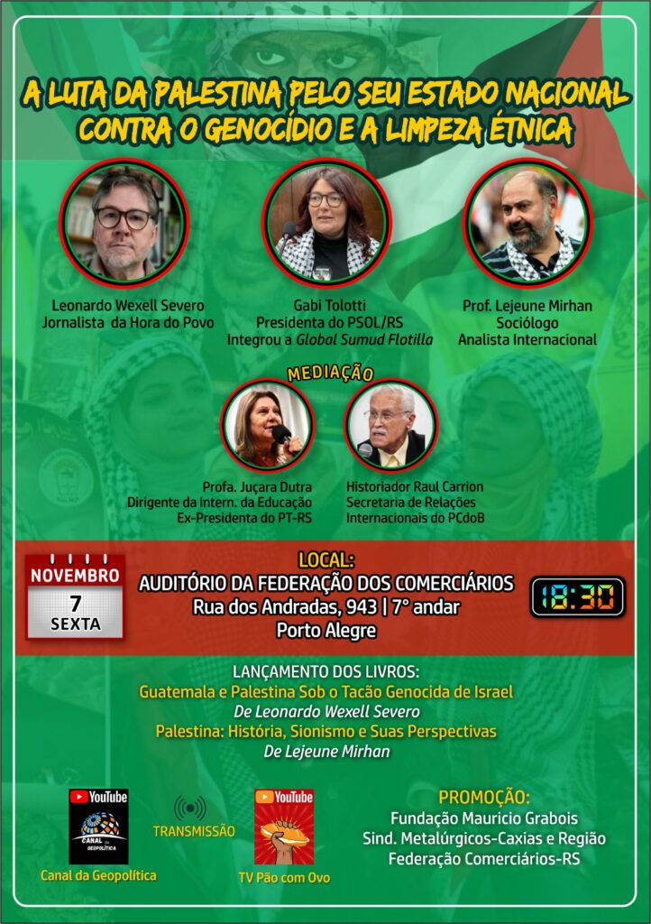 Em Porto Alegre, além de Leonardo, a mesa “A luta da Palestina pelo seu Estado Nacional, contra o genocídio e a limpeza étnica” contará com a participação de Gabi Tolotti, presidente do PSOL-RS e integrante da Flotilha da Liberdade; e Lejeune Mirhan, sociólogo e analista internacional, com a mediação de Jussara Dutra, ex-presidente do PT-RS e Raul Carrion, historiador e membro da Comissão Política do PCdoB-RS.