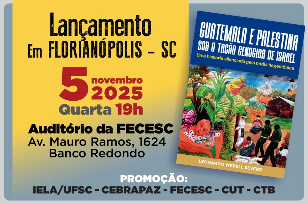 O livro “Guatemala e Palestina sob o tacão genocida de Israel – Uma história silenciada pela mídia hegemônica” (Editora Papiro, 126 páginas, R$ 35) será debatido nos próximos dias 5 (quarta-feira) em Florianópolis e 7 (sexta) em Porto Alegre com o autor, o jornalista Leonardo Wexell Severo, repórter internacional do Hora do Povo e membro do Sindicato dos Escritores de São Paulo.