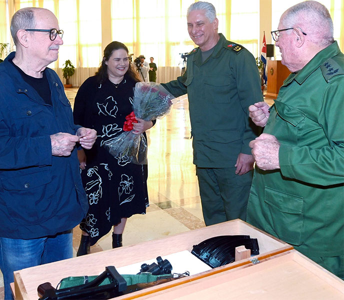 “Atendemos ao seu pedido”, afirmou o ministro das Forças Armadas Revolucionárias (FAR), Álvaro López Miera, ao entregar ao cantor e compositor o AKM que havia “exigido muito seriamente” para defender a pátria do invasor